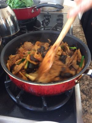 加两勺豆瓣酱翻炒至出红油,所有食材上色均匀