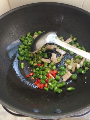 锅里加少许油,放入猪肉煸到肉出油 这时候加少许蒜末
