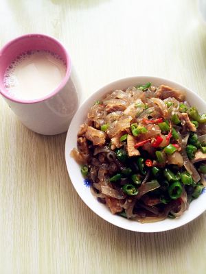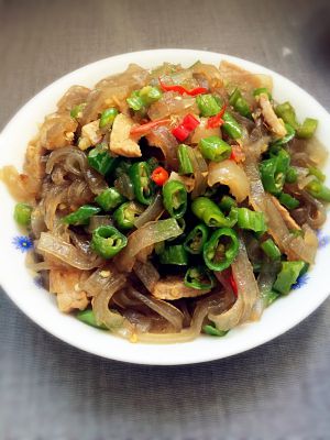 倒入薯粉翻炒加酱油,薯粉是熟的,炒几下就好,最后加点开水让粉别纠成一团也更入味一点