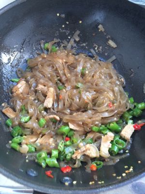 倒入沥干水分的荞麦米粉继续翻炒均匀,放生抽盐调味上色,放青椒炒香起锅前淋蚝油汁提鲜即可出锅装盘食用。