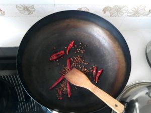 炒锅加油,放入花椒粒,干辣椒,爆出香味后捞出待用。