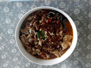 郫县锅中放油,油热后将姜末和郫县豆瓣酱放入翻炒,炒出红油香味,放入适量开水,将腌好的肉片滑入锅中,用筷子打散,肉变色即可出锅,连汤一同倒入大碗中。