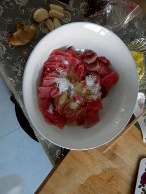 肉片洗净,放入适量淀粉、少量盐、生抽、料酒、鸡蛋清,搅拌腌制15min;
