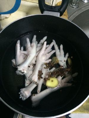 把风爪放进白水里还有放适量的花椒,姜片煮