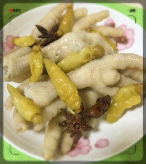 把泡椒到进凤爪里,花椒,姜片,洋葱,盐,鸡精放进拌匀。用保鲜膜封好放进冰箱放五天就可以吃了。