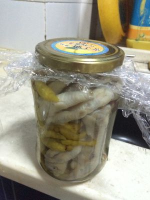 淘宝买的泡椒凤爪调料,成分有泡椒打碎的泥、盐、鸡精等调味的,也可以自己在家做,我为了省事买的现成的~