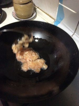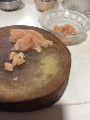 取嫩鸡胸肉,用刀把肉拍松,切成2厘米见方的小块,加少许料酒,油盐,淀粉拌匀
