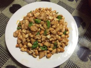 就入刚才七成熟的鸡丁,青椒,红萝卜,大火翻炒,汁被鸡丁收的差不多时加入花生和葱段,就可以出锅了