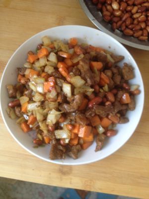 锅中倒入适量油,待油开倒入酱油和葱花爆锅,倒入备好的鸡腿肉进行翻炒,倒入红烧酱油翻炒,倒入备好的胡萝卜和圆葱,适量花生米和适量盐,不断翻炒几下即可