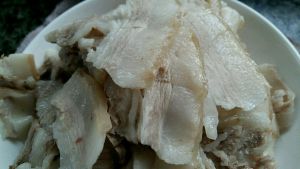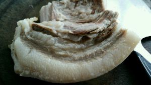 将煮熟的五花肉切片(可以用筷子试一下,能从皮戳下去就行了。)