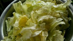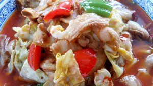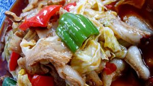 投入莲花白断生,在最后放入青、红椒,翻炒片刻加入醋、鸡精(味精)即可出锅。