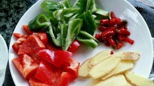 准备好青、红椒、姜片、泡辣椒三、四个就可以了,不吃辣的可以不放泡辣椒。