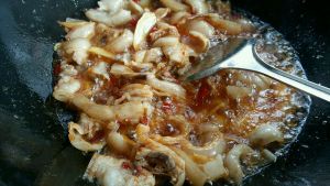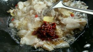 加入郫县豆办,翻炒至出油后,再放入一匙糖,料酒翻炒片刻。(如这里放了郫县豆办,就不放盐了)