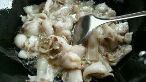 放入肉片和姜片,用小火慢慢煎炒至出油,表面色泽变金黄色。