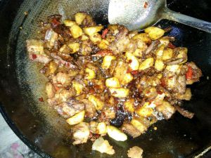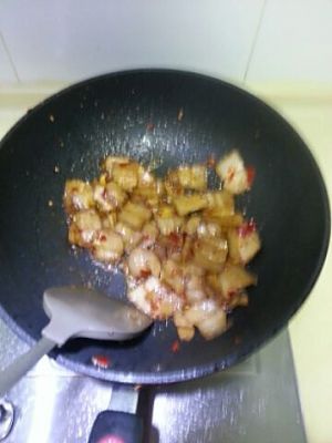 先要把五花肉去水,这就没图片了。去水之后切片放锅里扁炒,放两个八角个花椒,多的油要倒出来,然后放调料,白糖豆瓣酱和干辣椒,然后放土豆