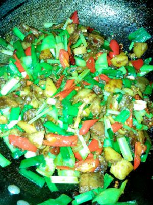 待土豆炒熟后放去青红椒蒜苗翻炒,最后加一点鸡精,就可以了