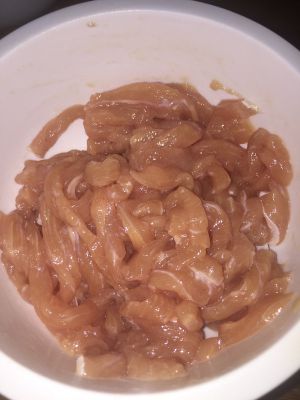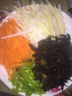里脊肉切丝,提前用蛋清,一点点盐,料酒,生抽,淀粉拌匀,最后加一点油,腌制好