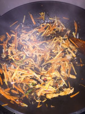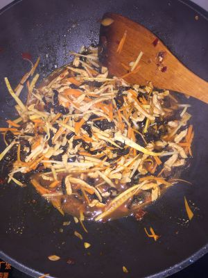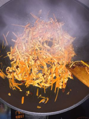 锅内放少许油,放备好的肉丝,将肉丝划开后盛出将锅刷洗干净,放入适量油,加入葱姜蒜末炒香,先放入胡萝卜丝炒软,再将木耳辣椒肉丝一起放到锅里翻炒,最后将调好的料汁倒入锅内继续翻炒片刻,鱼香肉丝就出锅了。绸,