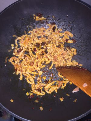 肉丝炒至变色盛起备用,重起油锅姜蒜煸香放适量剁椒稍许翻炒,入三丝炒几分钟下肉丝煸炒,放调好的酱汁,烧开,调入水淀粉。入葱花盛盘。
