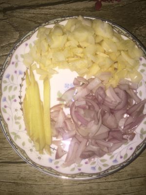 将醋一勺,酱油一勺,料酒一勺,糖两勺,水淀粉2勺调在一起,调成鱼香汁
