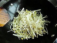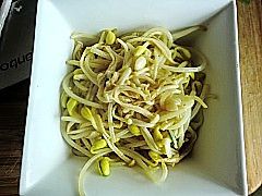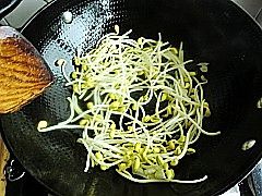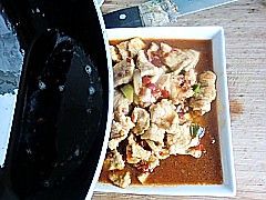 煮好的肉片盛入黄豆芽碗中,在浇入炸好的麻辣油即好。