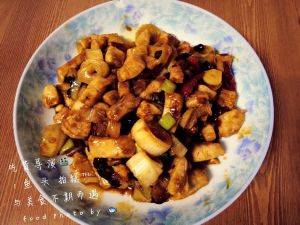 热锅凉油 放入葱花煸香 郫县豆瓣酱一同煸至香味 放入鸡丁翻炒 适量盐 待放入花生碎 大葱段翻炒 待关火淋入芝麻油 装盘
