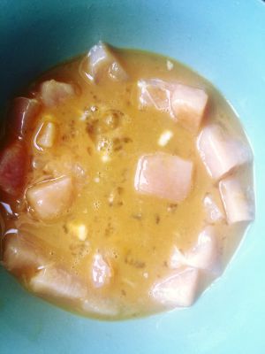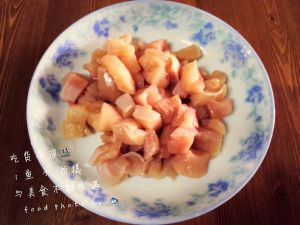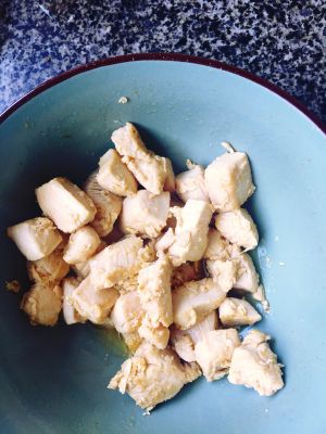 鸡肉切成一厘米见方小块.我用的是鸡脯肉(其实鸡腿肉比较嫩...然而比较麻烦处理我懒o(╯□╰)o).加入料酒.胡椒粉.生抽一点点.一个鸡蛋腌制半小时备用.