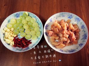 鸡腿肉切丁,黄瓜切丁,大葱切小段,泡红椒切碎备用
