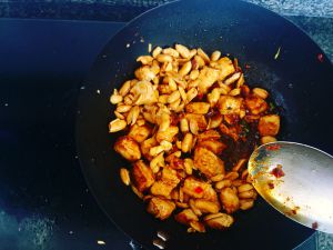 倒入鸡丁翻炒一小会.倒入炸好的花生米翻炒三十秒.加小半勺糖.倒入一小碗水淀粉.大火翻炒收汁出锅.