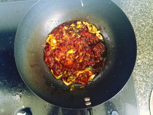 热锅凉油下葱姜蒜爆香.倒入两勺豆瓣酱(这里我用了一勺葱伴侣一勺郫县豆瓣酱.这样子出来不会太辣.喜欢辣的可以直接两勺郫县豆瓣酱).小火翻炒一下.