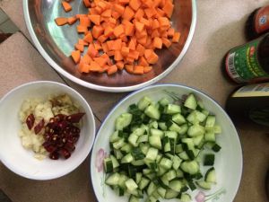 胡萝卜黄瓜切丁,再切点大蒜生姜辣椒