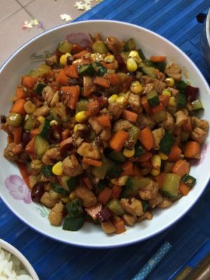 然后再烧锅,加入两勺猪油,随即放下青红椒爆炒四五下,再放入拌好的蒜蓉,也爆炒三四下,然后把鸡肉粒放下,随即放入酱油、味精、老抽、白糖、麻油、胡椒粉这些辅料,然后翻炒两三下后加入绍酒少许,然后下豆粉少许,再翻炒两三下,这道菜基本就完成了,然后就可以上盘吃饭了。