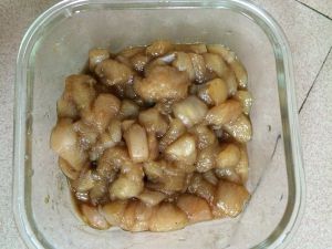 鸡胸肉切丁倒入生抽淀粉腌制,我还加入了十三香和孜然粉