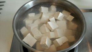 锅里烧水把豆腐煮一下,以便于定型不松散,煮开后的豆腐捞出来沥干水分备用。