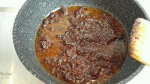 把豆豉煸炒出香味后,放入郫县豆瓣酱煸炒。