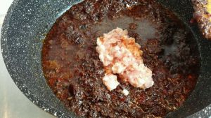 酱炒匀后加入腌制好的肉糜继续翻炒,然后加入少许李锦记红烧汁和适量的料酒继续翻炒。