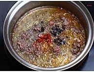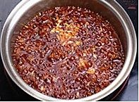 煸炒出香味红油后下入拍扁豆豉煸炒。