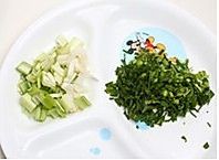 青蒜的茎部刨开切小段,叶部切小末。