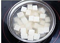 在清水里放少许盐,点几滴油把切好的豆腐在沸水中焯熟捞出。