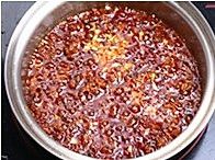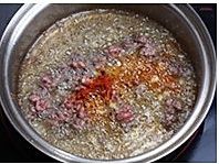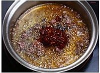 放入豆瓣酱炒出红油,再倒入辣椒面翻炒均匀。