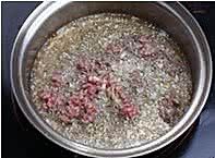 炒勺上火烧热,注入适量花生油煸炒牛肉末。