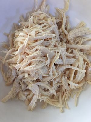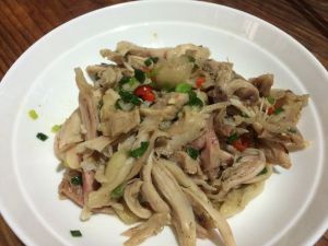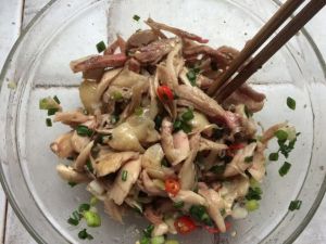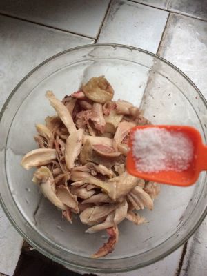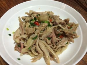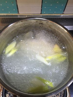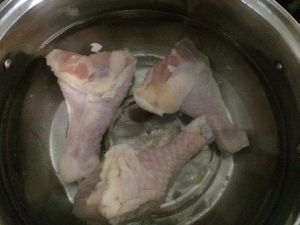 鸡腿冷水下锅,放几片姜片。热水下锅的话,鸡腿一遇热会收缩。而且这样煮,完全不用等水开了。水开后大概煮十五到二十分钟,鸡腿一定要煮透,因为之后就是凉拌了,防止不熟拉肚子哦。