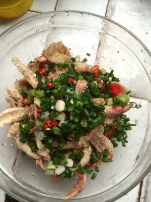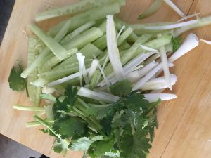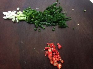 在煮鸡腿的时间里,先把葱和辣椒切好,喜欢吃蒜的可以把蒜剁碎放下去去除味道和解腻(我不喜欢吃生蒜,所以没放)