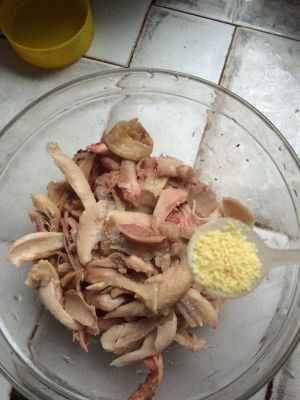 4、土鸡局部开花刀,土鸡内外涂抹食盐约20克,料酒,味极鲜内涂,局部整理土鸡。