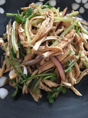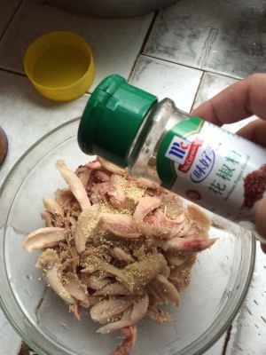 鸡肉丝,所有蔬菜丝,放生抽,盐,糖,醋,辣椒油,香油,搅拌均匀