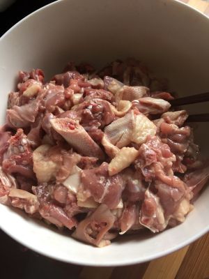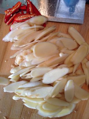 子姜切片,赤椒切成两半,鸭肉洗干净沥干水待用