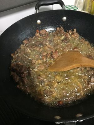 放水,如图。倒一点老抽、酱油、料酒。中火至水焖快干,放盐,收火。简单好味!