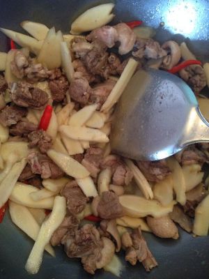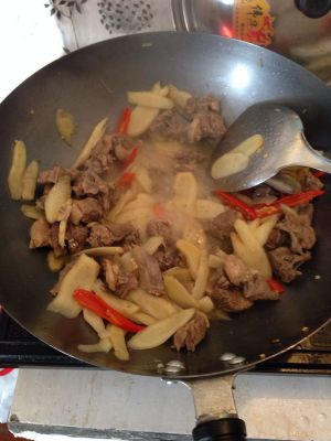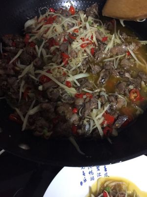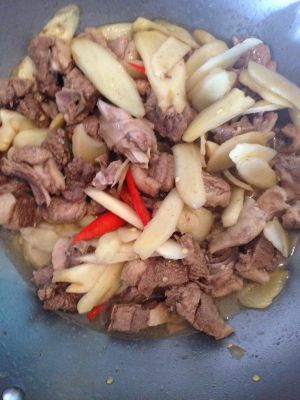 待水干后将红辣椒放入一起和鸭肉翻炒5~6下,再把子姜一起放入,翻炒2~3分钟直到能闻到子姜的香味。