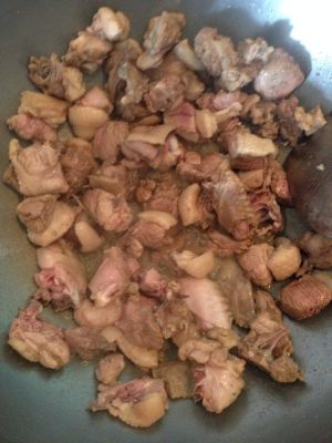 大火开起,将洗好的鸭肉倒入锅中翻炒,把鸭肉中的水分炒出来后将水沥出。