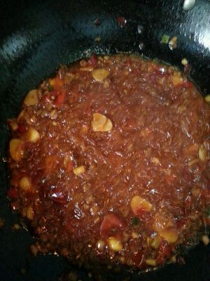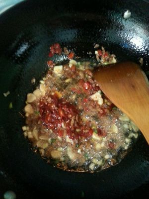 加入豆瓣酱炒出红油,下料酒,生抽老抽.